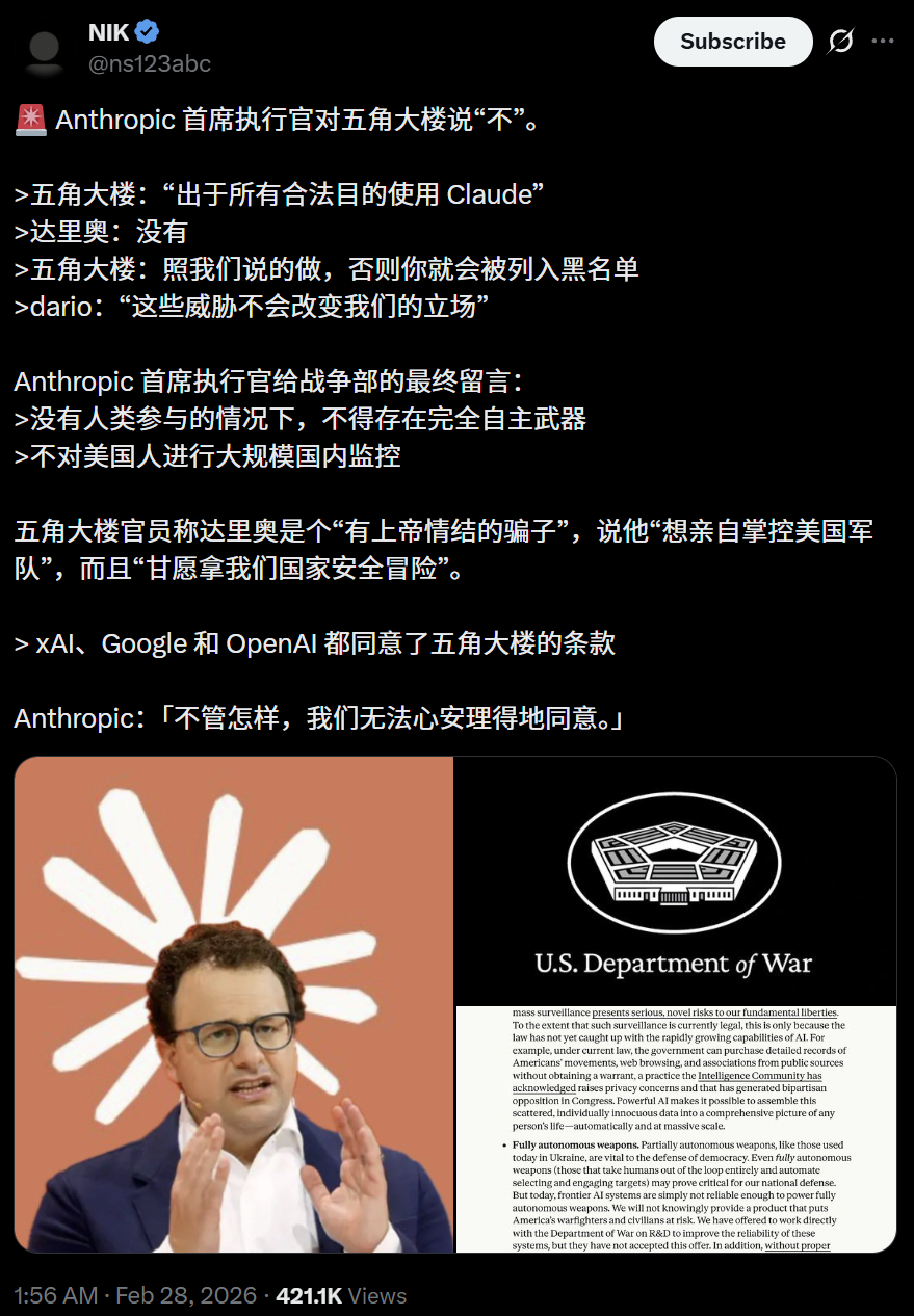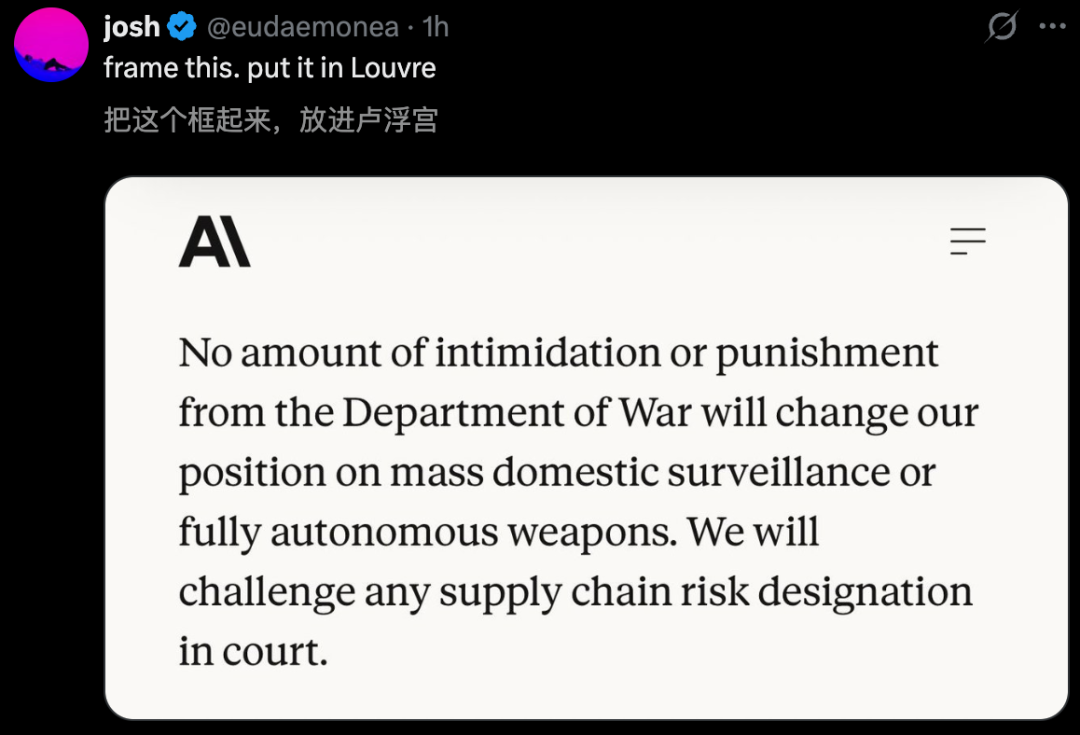 面对国防部的重压和「供应链风险」的封杀威胁,Anthropic毫无惧色,甚至直接宣布: