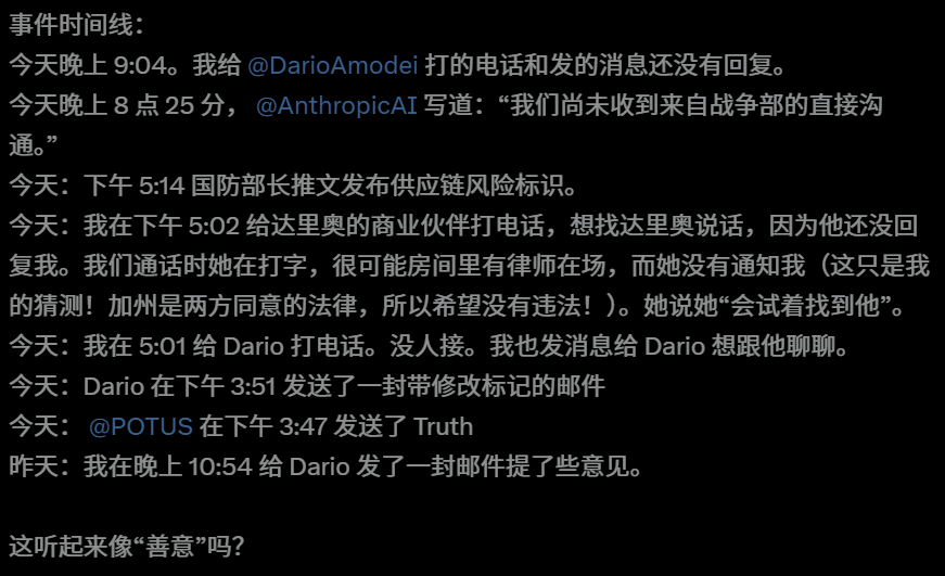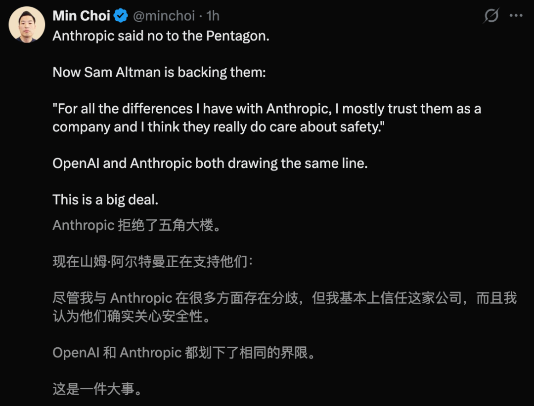 他直言不讳地指出,事情发展到这一步,早就超越Anthropic一家公司的范畴,演变成了关乎整个AI行业的重大议题。