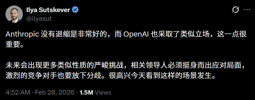 就连消失许久的Ilya Sutskever突然现身,公开点赞Anthropic、OpenAI:在关键问题上没有退缩极其难得。