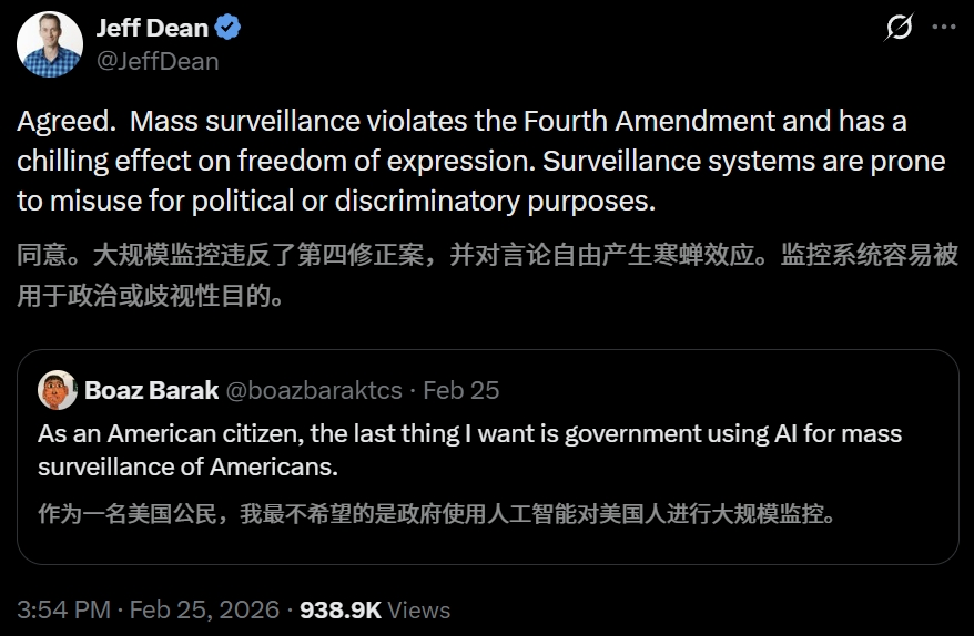 还有谷歌首席科学家Jeff Dean,也公开表示,大规模监控违反了法案,并对言论自由产生了寒蝉效应。