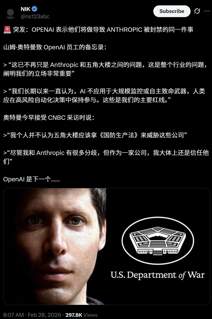 周四晚间,奥特曼曾向全体员工发送备忘录明确表态:OpenAI将守住与Anthropic相同的红线。