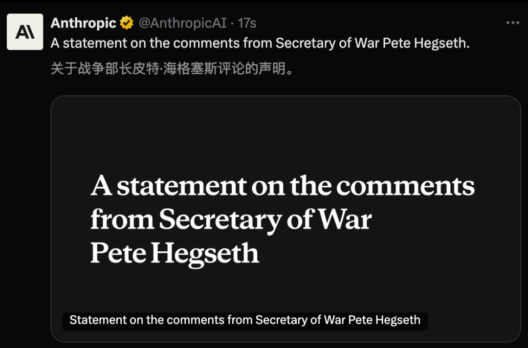 就在刚刚,Anthropic针对Pete Hegseth的观点,发表了一份最新声明。