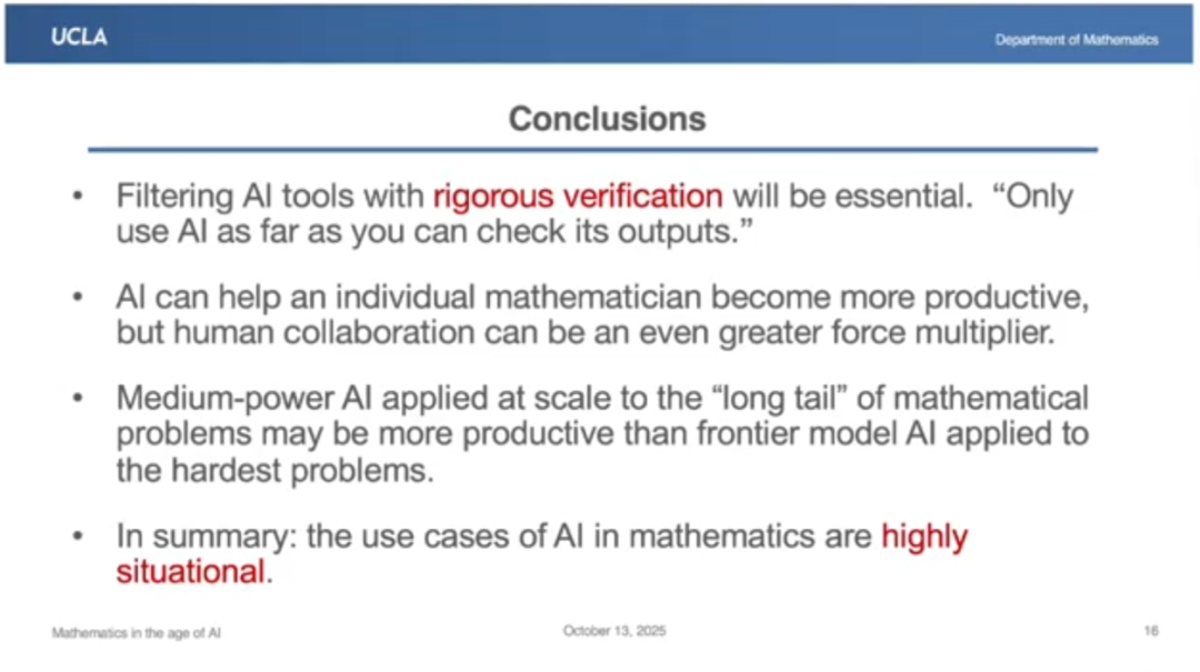 AI应处理“中等难度长尾问题”,而非替代数学家攻坚。 最有效的应用方向不是让AI挑战人类最擅长的创造性难题,而是让它完成第一遍筛选,再把真正困难的留给人类专家。