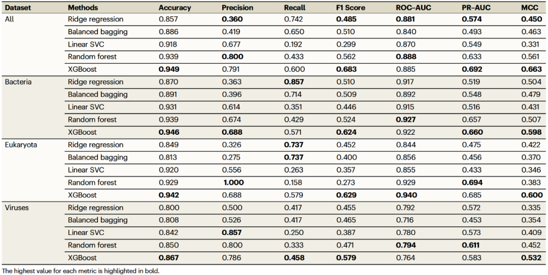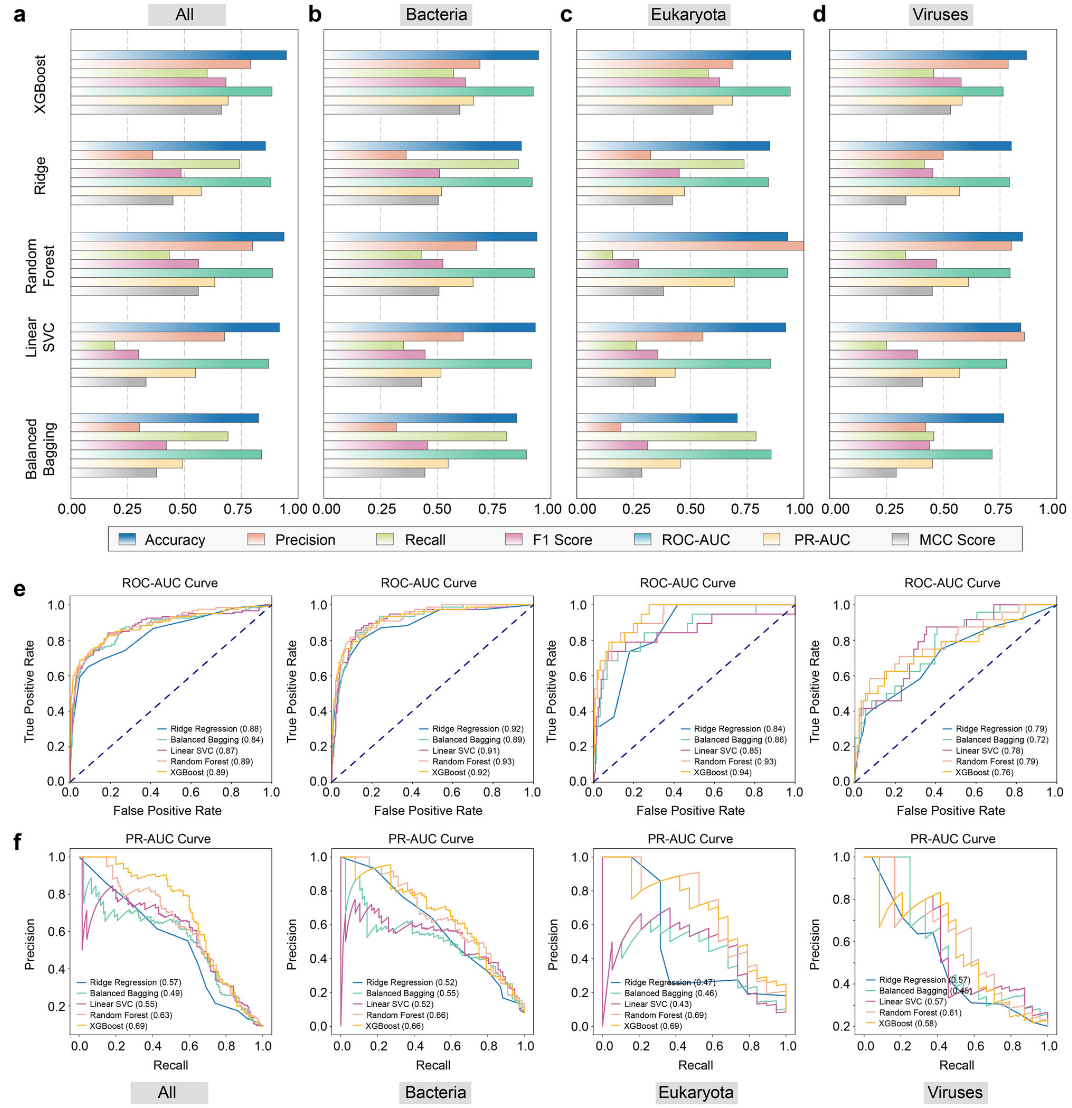 在病毒、细菌和真核病原体上的综合评估表明,XGBoost在抗原预测任务中表现最优(图3和表1)。具体而言,在序列-结构特征融合条件下,XGBoost是跨病原体抗原预测的最优模型,能够同时优化判别能力(ROC-AUC)和类别不平衡鲁棒性(PR-AUC)。