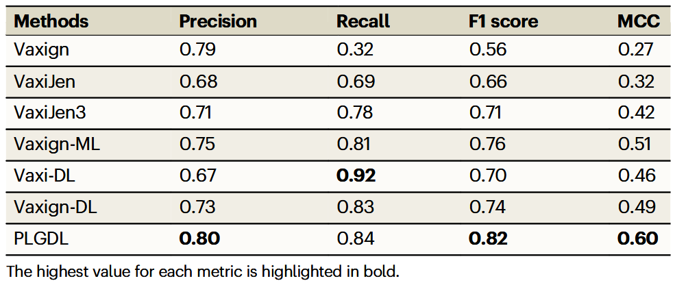 表2结果显示,PLGDL在疫苗抗原识别方面具有最优预测能力,体现在Precision、F1-score和MCC等关键指标上。此外,基于氨基酸序列的深度学习模型Vaxign-DL与Vaxi-DL也表现出良好性能。总体而言,这些结果凸显了PLGDL通过序列–结构特征融合所带来的稳健性与性能提升。