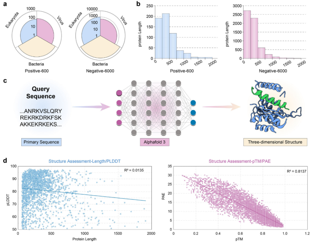 在本研究中,仅纳入符合以下标准的保护性抗原:即在体内已被证明能够在病原体攻击实验中提供保护,或能够诱导与保护结局直接相关的抗原特异性免疫反应的蛋白质。基于这一严格标准,从Protegen数据库和PubMed文献整理数据,并去除冗余后,获得了一个高置信度的600个保护性抗原集合;通过从UniProt数据库所列病原体基因组中提取全部已注释蛋白序列,随机选择并剔除与正样本同源的序列,构建了不平衡的负样本数据集。最终整理后的负样本为6000个,形成了1:10的正负样本比例,更贴近生物学现实(图2a)。该抗原数据集覆盖了广泛的蛋白序列长度范围,确保其在多种生物学场景中的适用性(图2b)。所有6600个蛋白结构均使用AlphaFold3重新预测(图2c),结构置信度通过关键指标进行评估。