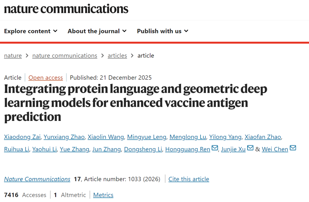 Zai, X., Zhao, Y., Wang, X. et al. Integrating protein language and geometric deep learning models for enhanced vaccine antigen prediction. Nat Commun 17, 1033 (2026).