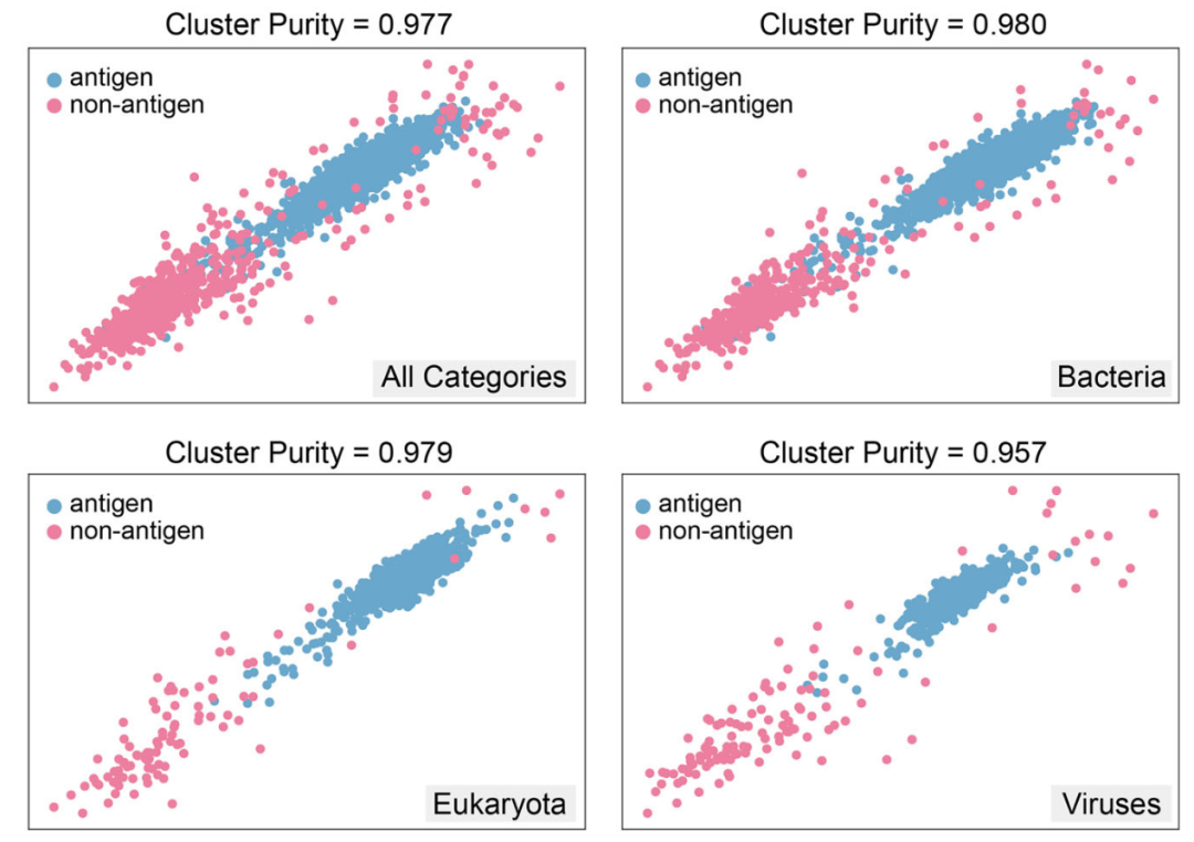 随后采用簇纯度指标量化聚类质量,即评估每个簇在真实标签上的同质性。较高的簇纯度意味着簇内数据点主要属于同一真实类别,说明特征空间分离良好。细菌类别获得了最高簇纯度(0.980),与其在表1中的最佳分类性能完全一致,凸显了模型在细菌抗原预测方面卓越的判别能力。这种稳健的聚类表现说明细菌抗原特征在嵌入空间中既具有高度区分性又具有良好内聚性,从而实现高可靠分类。相比之下,病毒类别的聚类略弱(0.957),可能归因于其抗原数据量相对有限。总体而言,观察到的簇同质性,尤其是在细菌和真核亚组中,验证了模型能够编码具有生物学意义的保护性抗原特征。