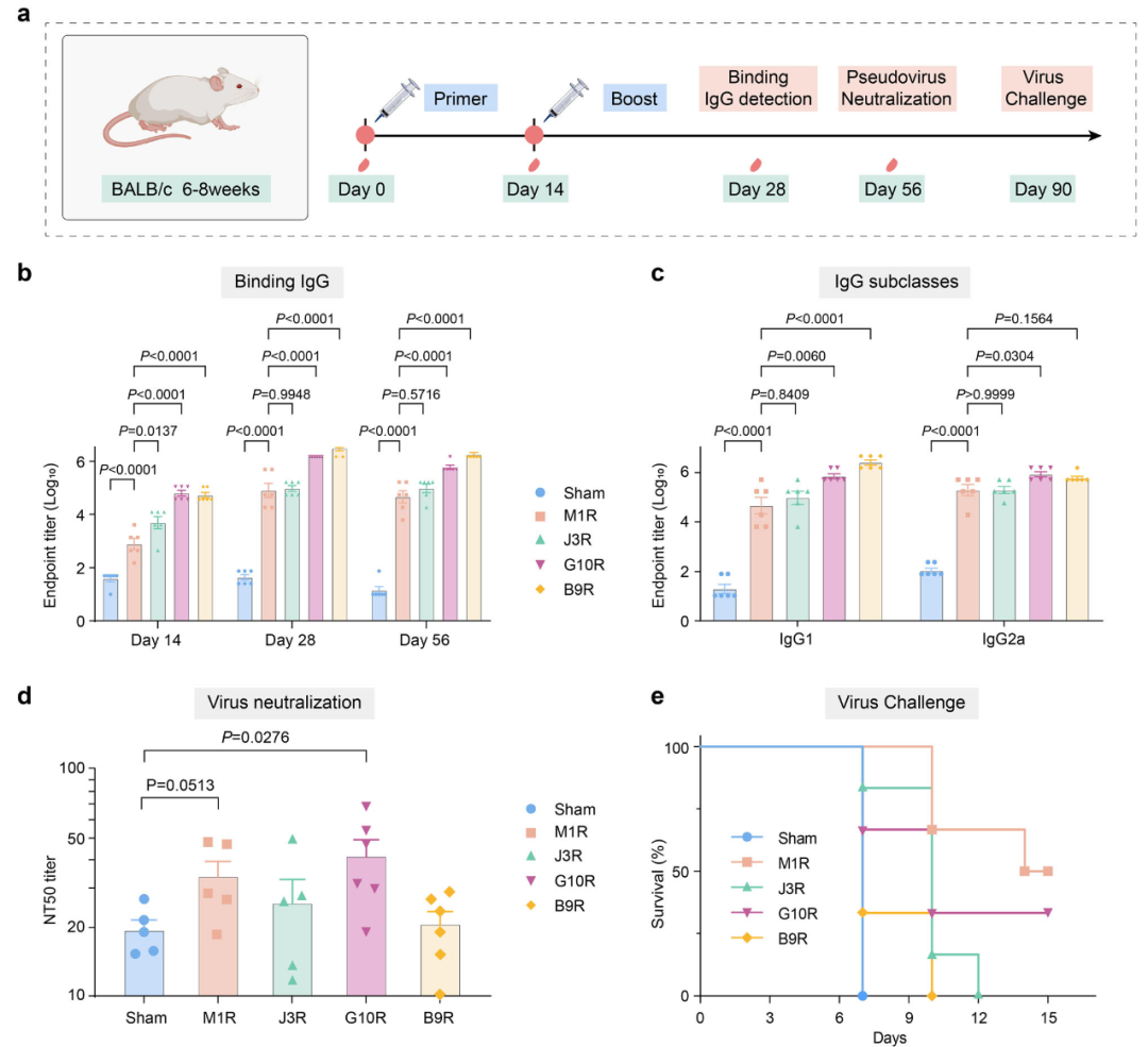 为验证模型预测准确性,成功表达了4种抗原并在小鼠模型中进行免疫评估,包括已验证对照抗原M1R、两个高分候选J3R、G10R、一个低分抗原B9R(图5c,d)。免疫结果表明,所有候选抗原均能诱导强烈的特异性体液免疫反应,其抗体水平达到或超过阳性对照M1R(图6b)。值得注意的是,在加强免疫后G10R抗体水平为M1R的18倍,B9R抗体水平为M1R的37倍。抗体亚类分析显示,这些抗原诱导了平衡的Th1/Th2免疫反应,提示其具有广泛免疫原性潜力。然而,在保护效力方面出现关键差异。G10R在针对鼠痘病毒的微量中和实验中产生与M1R相当的中和抗体,在致死攻击模型中提供部分保护,序列比对显示其与ECTV同源蛋白高度保守,强力支持其生物学相关性;B9R虽然免疫原性极强(分泌蛋白),但未产生保护作用。这一鲜明对比验证了模型能够有效区分仅具免疫原性的抗原与真正具有保护性的疫苗候选抗原。