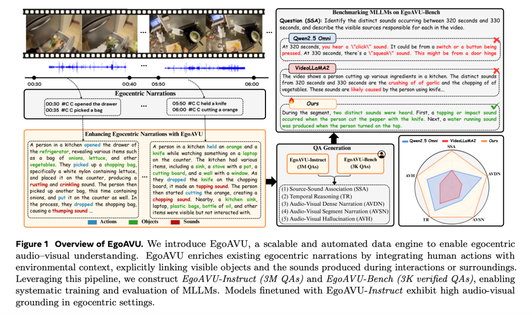 EgoAVU是一个完整的数据生产系统,可以自动理解视频中的声音-视觉关系、自动生成高质量问答与叙述数据、自动筛选最具跨模态信息的视频,最终形成可规模扩展的数据流水线。