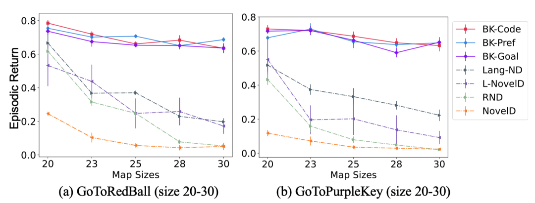 更令人惊喜的是,背景知识对新任务和更大规模环境的泛化能力也得到了验证。作者让智能体在Minigrid中只从简单的“Goto”类任务提取知识(即导航去找单一目标物品),然后测试在更加复杂的新任务上,例如需要按顺序找两个目标(Goto-seq)或找到目标后执行拾起动作(Pickup)。