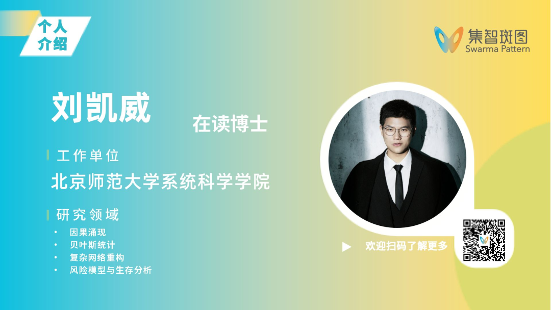 主讲人:刘凯威,北京师范大学系统科学学院博士研究生。研究领域,涉及统计学方向的生存分析、贝叶斯统计,以及复杂系统方向的复杂网络重构、规模法则、因果涌现等问题。目前已在National Science Review、Physica D、Physical Review E等学术期刊发表多篇论文。