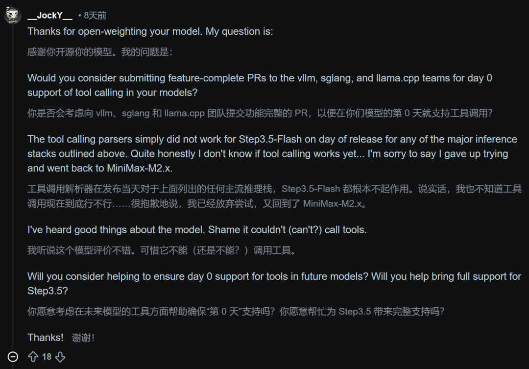 有开发者尖锐地指出,Step 3.5 Flash在发布首日,工具调用在vLLM、llama.cpp等主流推理栈上完全不可用,甚至直接放弃测试退回了竞品模型。