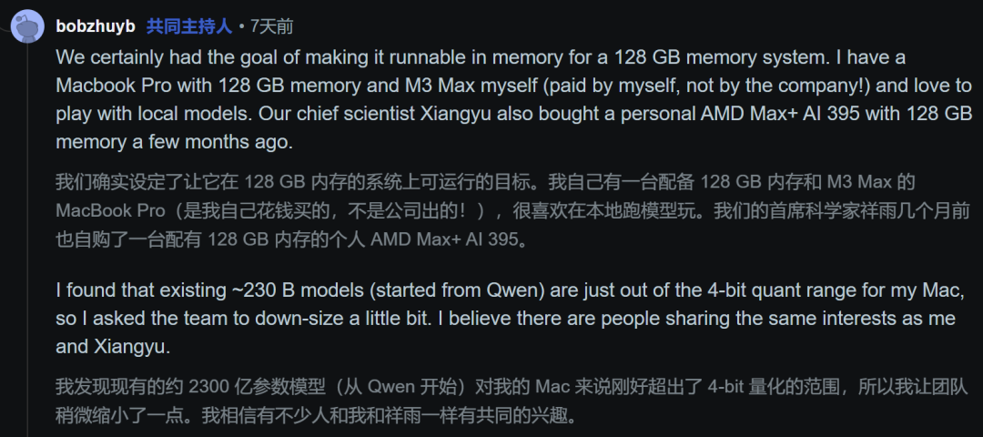 我们的确有一个目标,就是让它能够跑在一个128 GB内存系统的内存中。我自己为了跑模型,自掏腰包买了一台128GB内存的Macbook Pro,而我们的首席科学家也买了一台128GB内存的AMD机器。