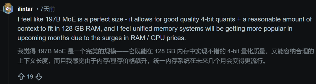 知名评论者ilintar激动地留言:「我觉得196B MoE是一个完美的参数规模——它允许高质量的4-bit量化加上合理的上下文长度刚好能放入128 GB内存中。」