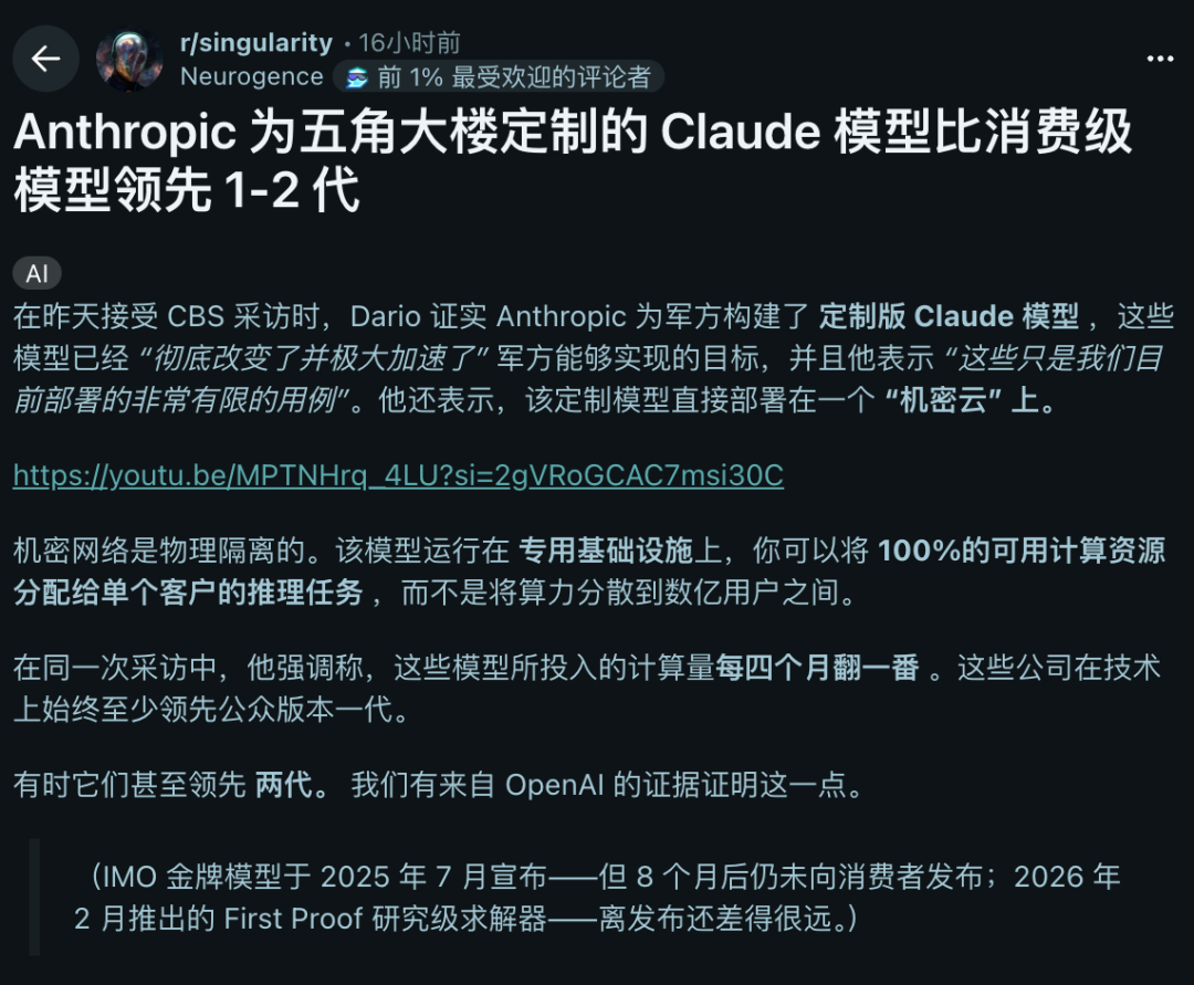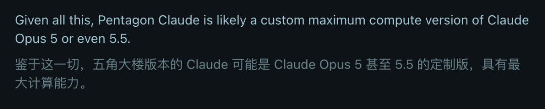 据传,这款军用定制版要比你我手里的Opus 4.6领先一到两代——