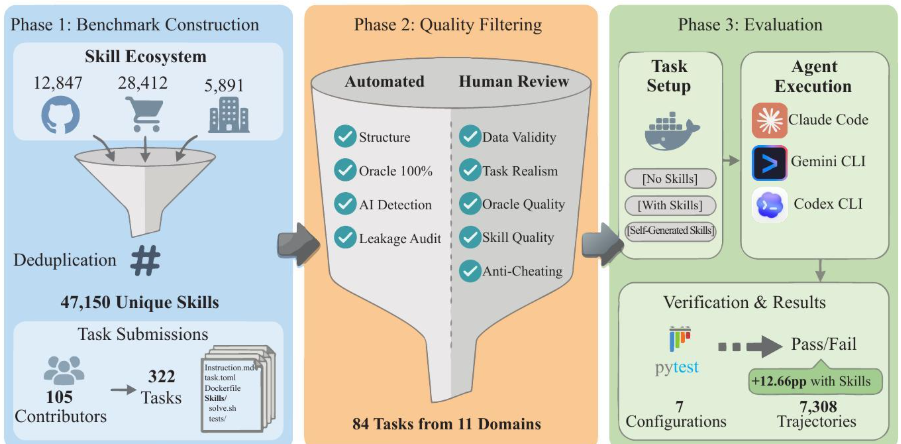 针对每一项任务,我们均在三种条件下进行评估:不使用任何技能、使用人工筛选的技能,以及使用智能体自生成的技能。我们在7种智能体-模型组合上共运行了7,308条推理轨迹。结果表明,采用人工筛选的技能后,平均通过率提升了16.2个百分点(pp),但提升效果因领域而异(软件工程领域仅提升+4.5pp,而医疗健康领域则高达+51.9pp),且在全部84项可比任务中,有16项反而出现负向增益(即性能下降)。
