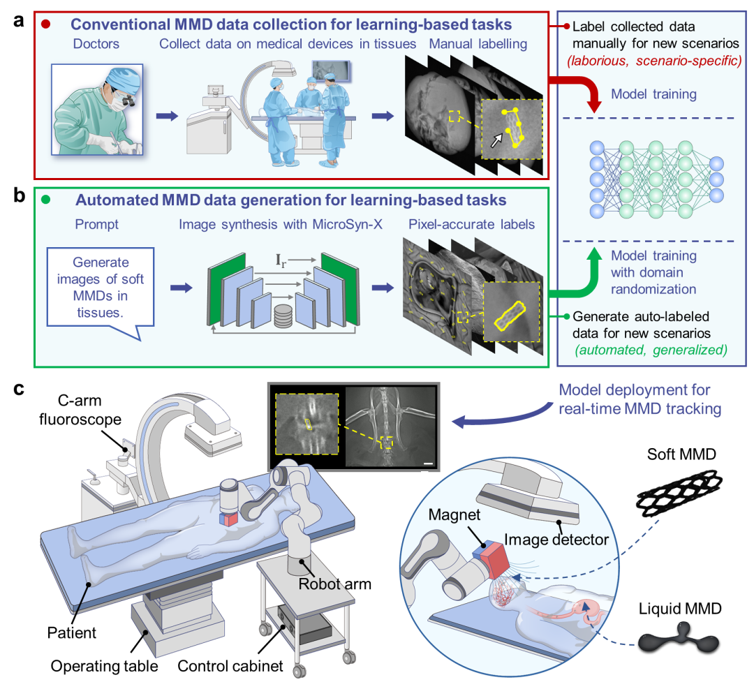 与以往依赖海量临床影像或特定硬件改进的方法相比,MicroSyn-X的核心优势在于其通用性与可扩展性。当面对一种形状、材质完全不同的新型医疗器械时,研究人员无需重新进入手术室采集影像,仅需通过合成管线进行数小时的自动化训练,即可实现对新器械的部署与控制。