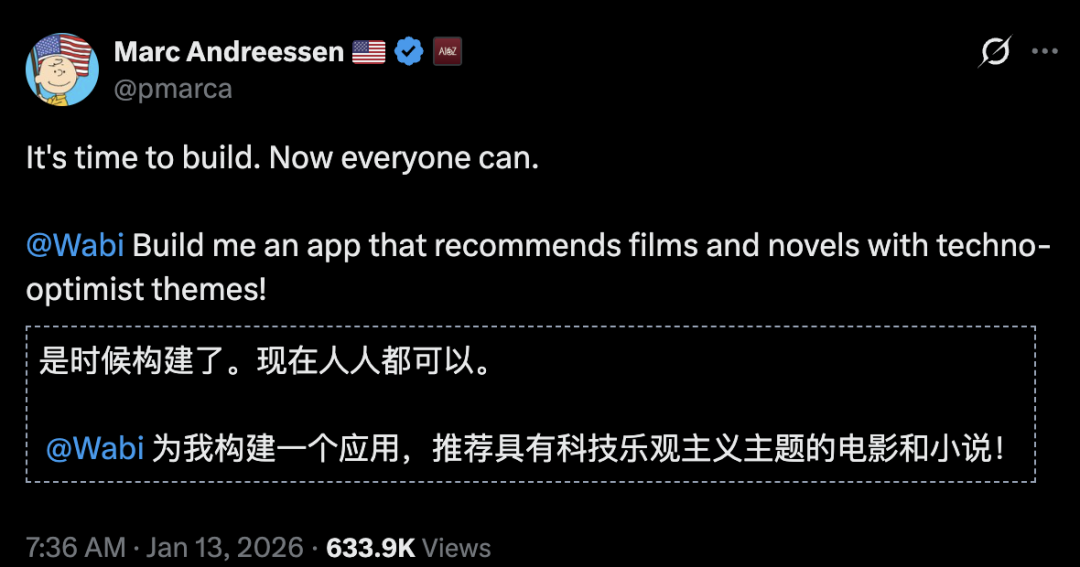 a16z创始人Marc用Wabi造出了一套techno-optimist(技术乐观主义)风格的电影和小说推荐系统;