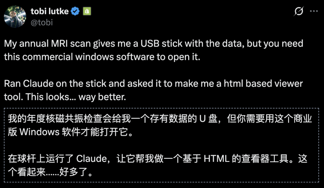 Shopify首席执行官Tobi自己做了个 MRI 仪器的图像分析工具,原本这得靠商用软件才搞得定;