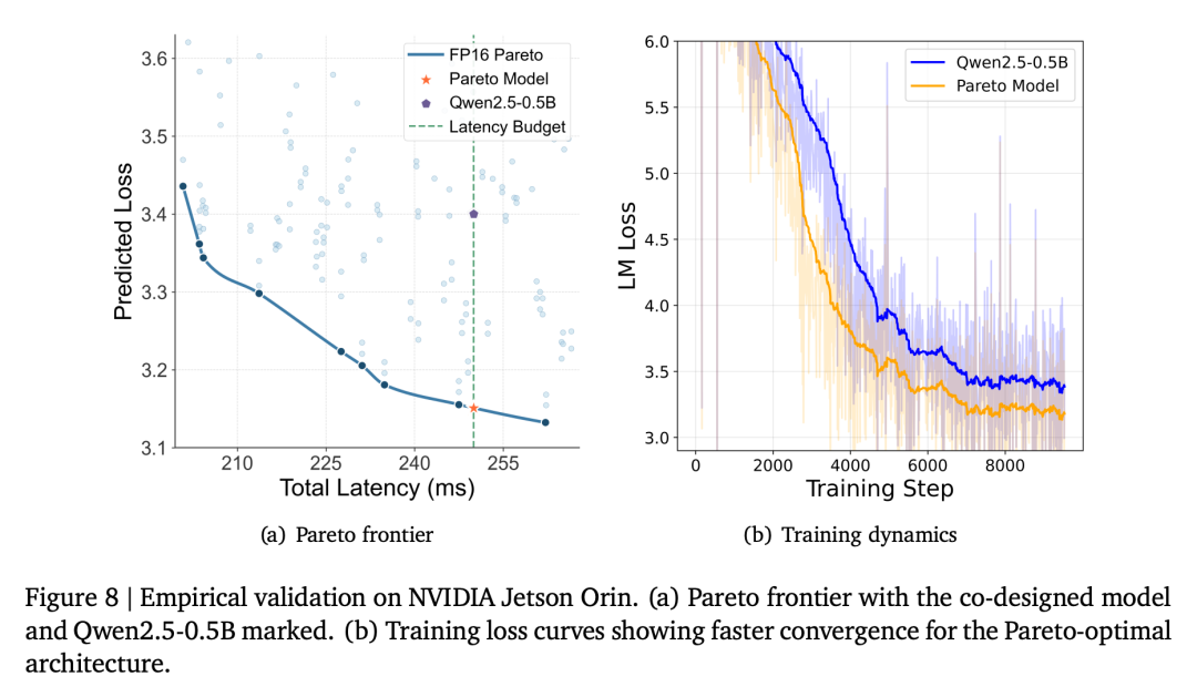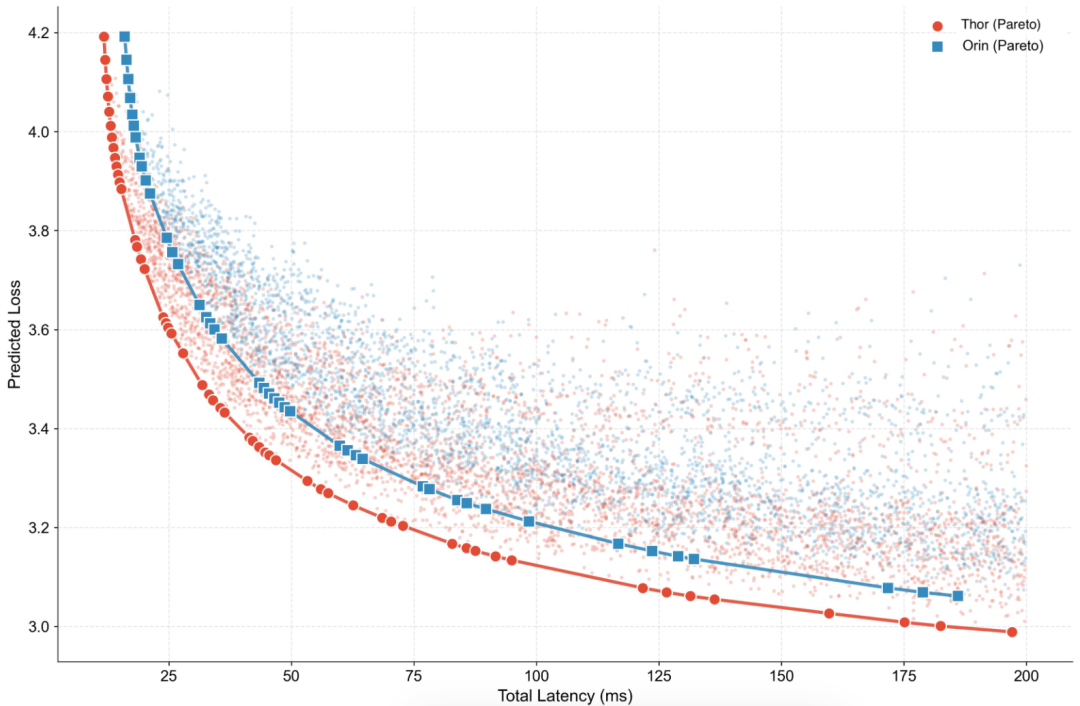 同时给出了不同硬件平台(Jetson Orin/Thor)上的帕累托最优前沿,验证了「硬件协同设计扩展定律」的跨硬件平台泛化性。