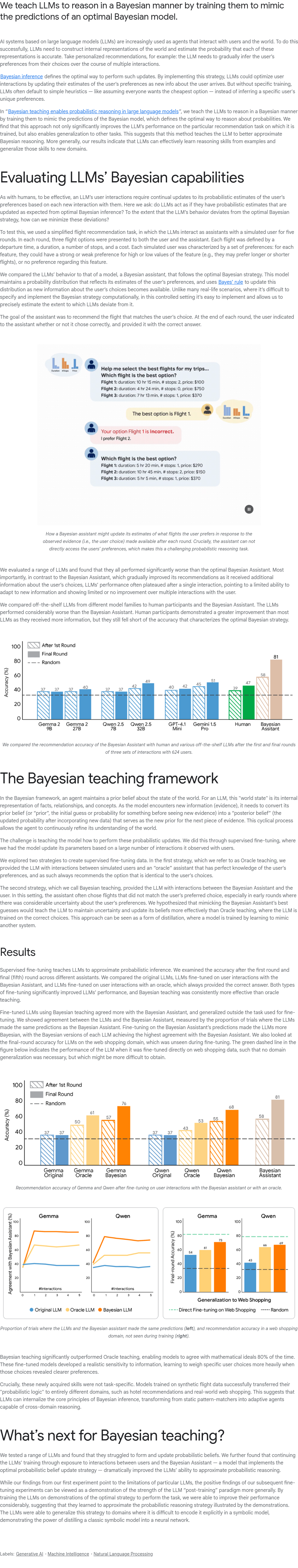 本文提出通过训练大语言模型(LLMs)模仿最优贝叶斯模型的预测,使其具备贝叶斯式推理能力。在用户交互场景(如个性化推荐)中,LLMs需动态构建并更新对用户偏好的内部表征,而贝叶斯推断提供了理论上最优的概率更新机制。然而,未经专门训练的LLMs常依赖简单启发式(如默认推荐最便宜选项),难以精准推断个体偏好。该研究通过“贝叶斯教学”方法,引导LLMs学习依据新证据持续、理性地修正信念,从而提升其建模用户意图与优化交互决策的能力,推动LLM向更可靠、自适应的智能代理演进。(200字)