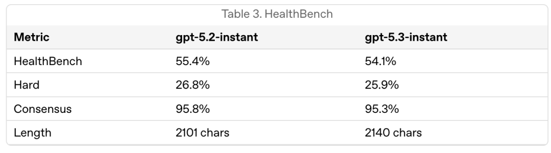 在HealthBench基准上,三种不同版本测试中,GPT-5.3 Istant整体的幻觉率,要比上一代低。