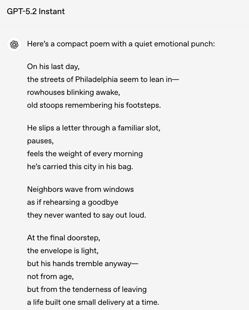 比如,让模型以「费城一位退休邮递员最后一次送信」为题,写一首短诗。
