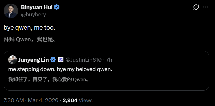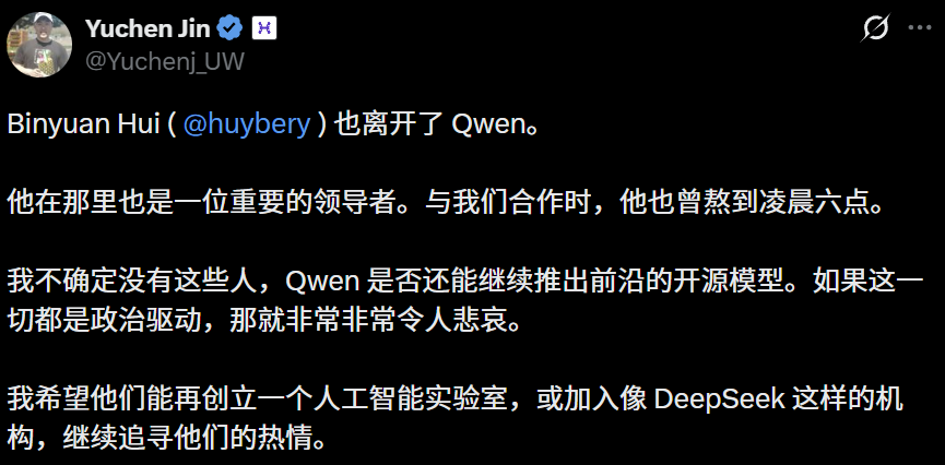 与此同时,还有两位Qwen团队的研究员几乎在同一时间宣布离职。