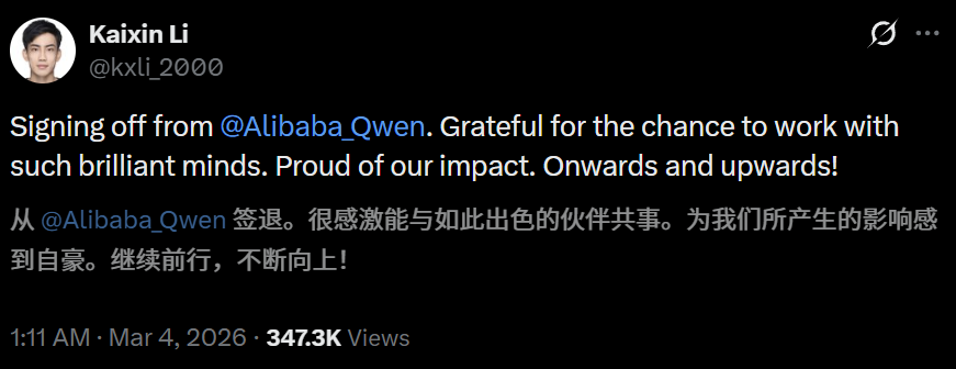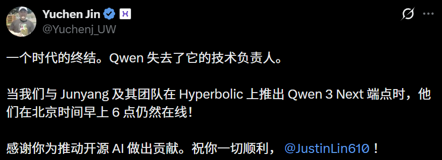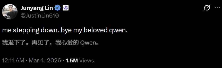 深夜,Qwen的灵魂人物林俊旸突然官宣,正式卸任,即将离开千问项目。