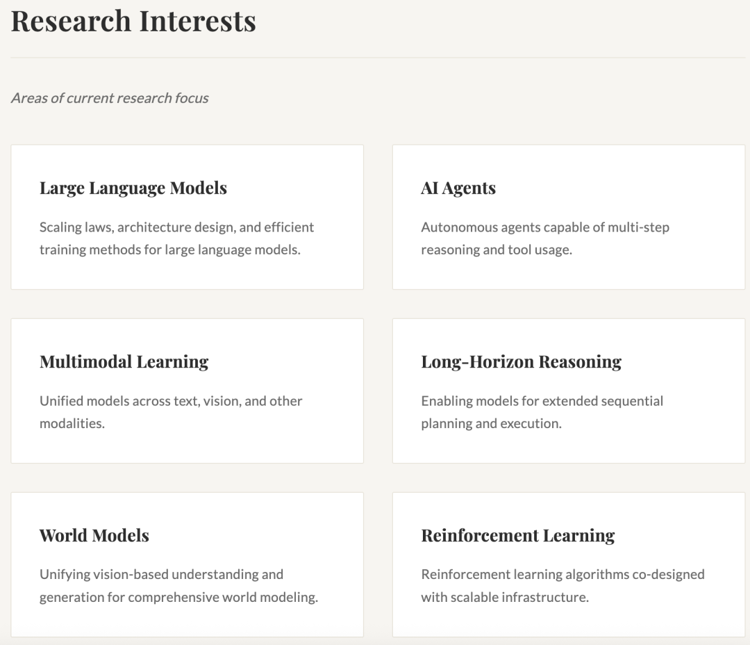 他的目标是构建自主编程模型,个人研究兴趣包括:基础模型、推理模型、编程智能体、计算机操控智能体。