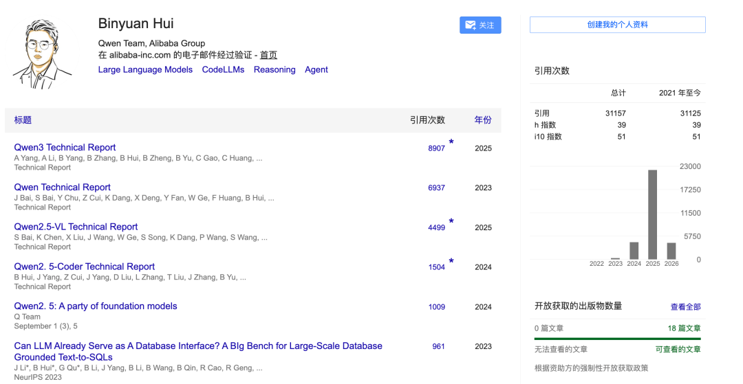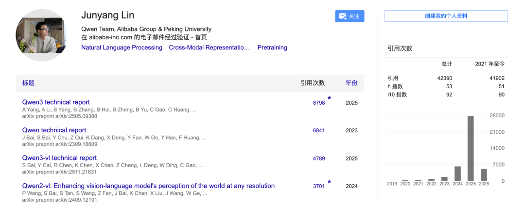 从Google Scholar中可以看出,他曾参与Qwen基础模型、编码模型多项训练和研发,被引数超3万。