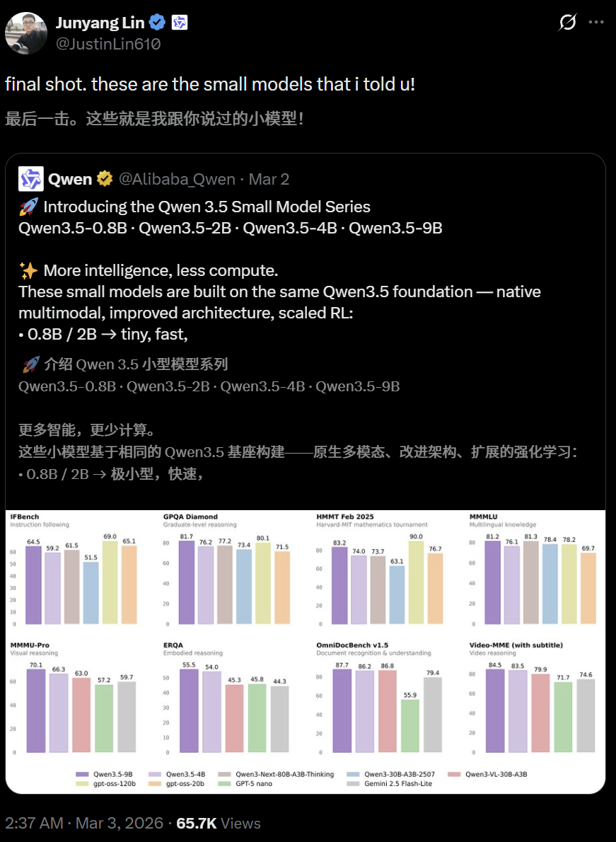 昨天,他还在安利Qwen 3.5最新的一批小模型,覆盖了0.8B、2B、4B、9B四种参数。