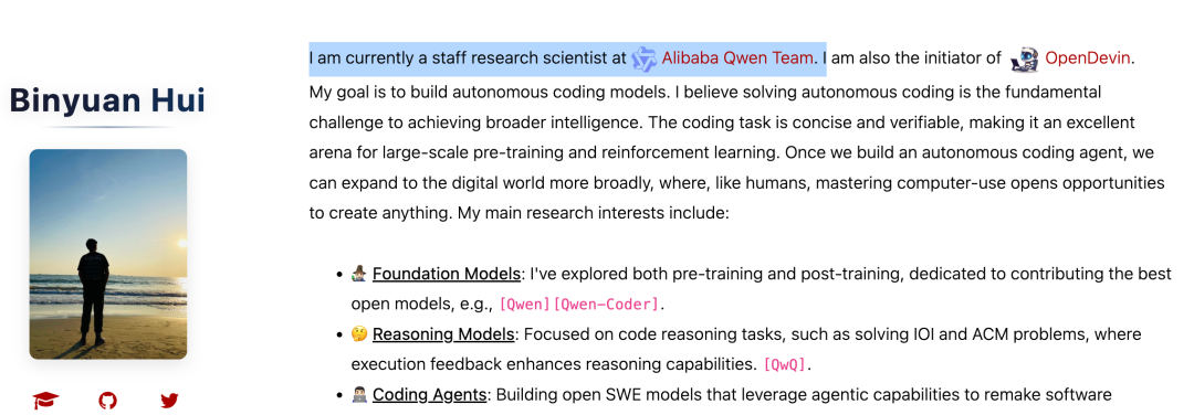 Binyuan Hui曾是Qwen团队的资深研究科学家,也是OpenDevin项目的发起人。