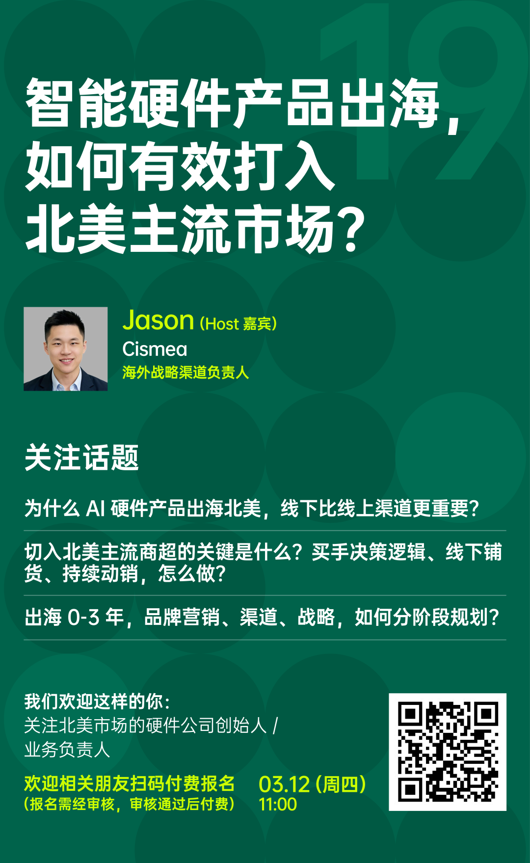Founder Park 邀请 Jason,围绕「智能硬件产品,如何出海北美市场?」核心话题,来进行线上分享和实时交流。