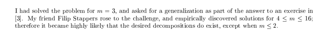此前,高德纳已经解决了m=3的情况,他的朋友Filip Stappers又通过实验找到了4≤m≤16的解。