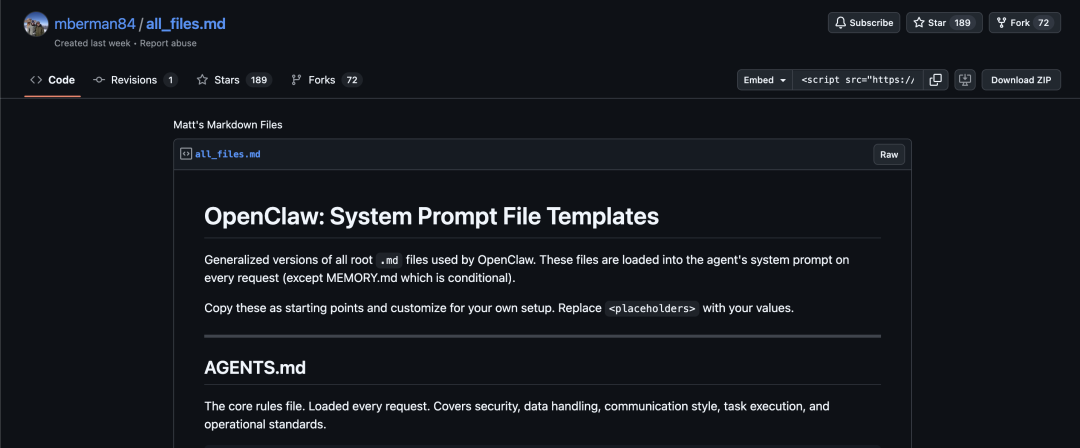 为了防止提示词漂移,他把行为守则拆成好几个文件,agents.md管执行流程,soul.md定义性格,user.md记录老板的各种偏好。