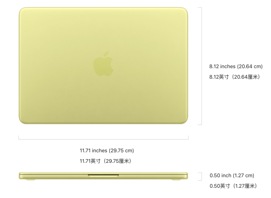 机身厚度1.27厘米,宽29.75厘米,重量1.23kg,差不多 一瓶矿泉水的重量和一本杂志的尺寸。