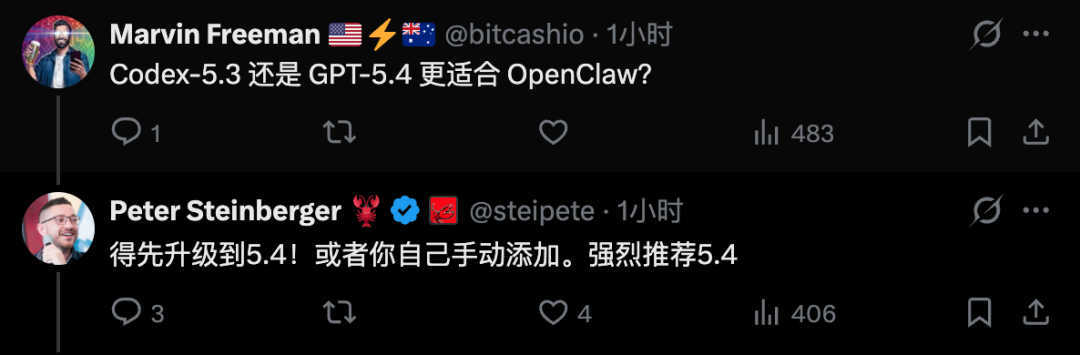 OpenClaw的创始人Peter推荐将OpenClaw的版本升级到5.4之后,再配合GPT-5.4。