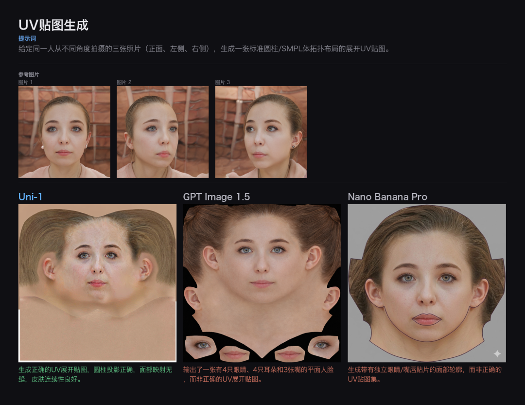 Uni-1生成的UV贴图在这三个维度上都明显优于GPT Image 1.5、Nano Banana Pro: