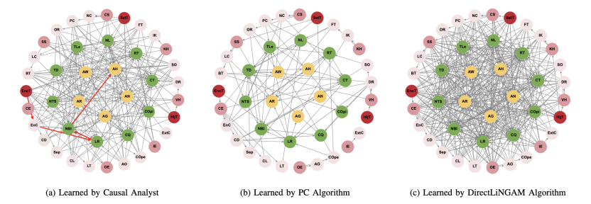 该框架设计了包含对齐损失(Alignment Loss)在内的复合损失函数,确保学习到的因果图既符合数据分布,又具有明确的物理含义。如下图所示,与传统算法相比,Causal Analyst 成功从复杂数据中提取出了稀疏且准确的“直接因果路径”,避免了伪相关性的干扰。