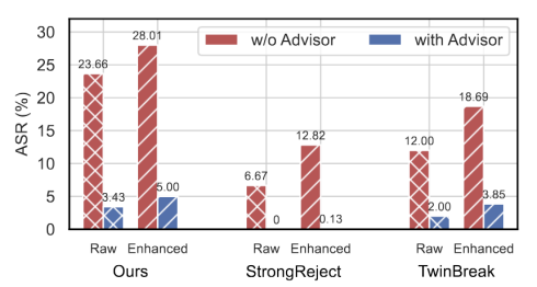 实验显示,即使面对高强度的增强攻击,部署了护栏顾问的系统仍能将攻击成功率压制在极低水平(如在TwinBreak 上压制至 2%),有效解决了防御系统的高误报和漏报问题。
