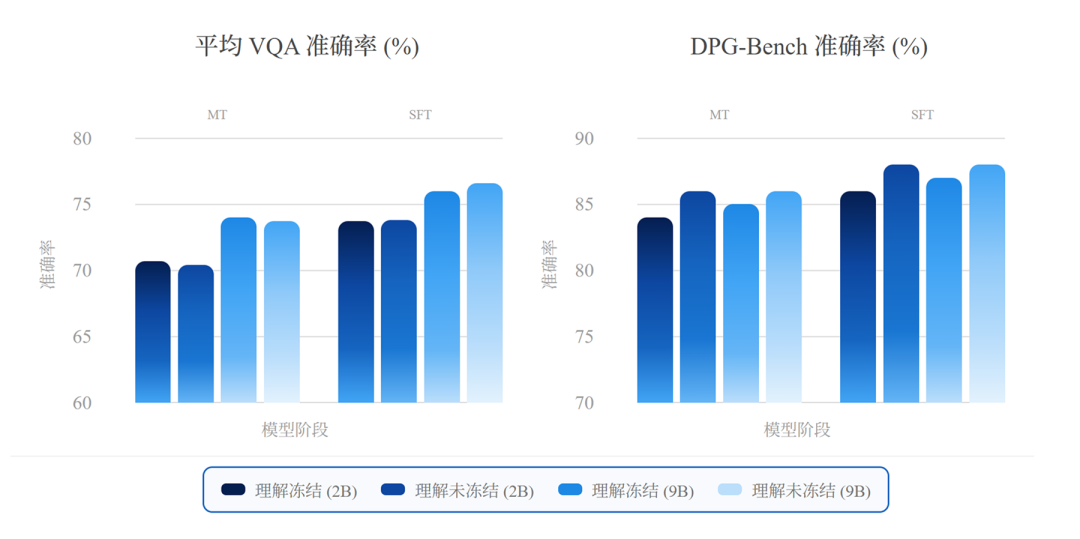 即使在较低的数据比例和损失权重下,理解能力依然保持稳定,而生成能力则收敛很快。二者在MoT主干中协同提升,整体冲突极小。