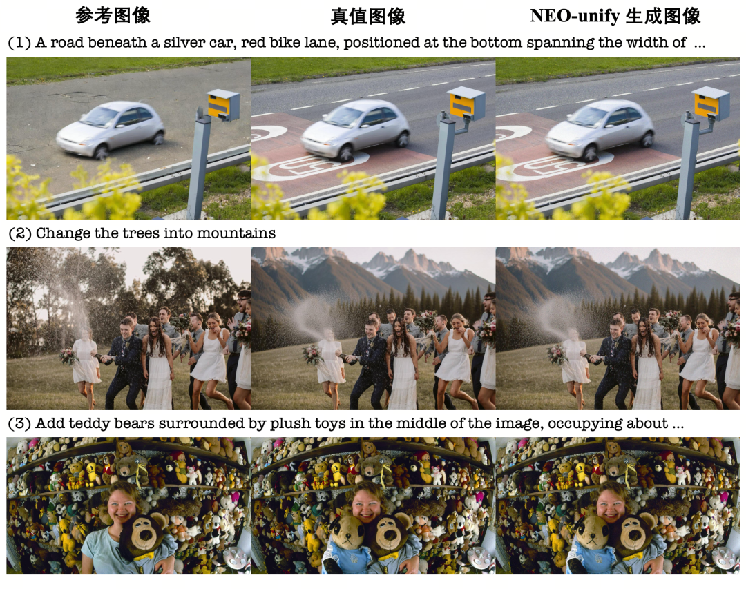 即使在冻结理解分支的情况下,NEO-unify(2B) 仍展现出强大的图像编辑能力,同时显著减少了输入图像令牌的数量。
