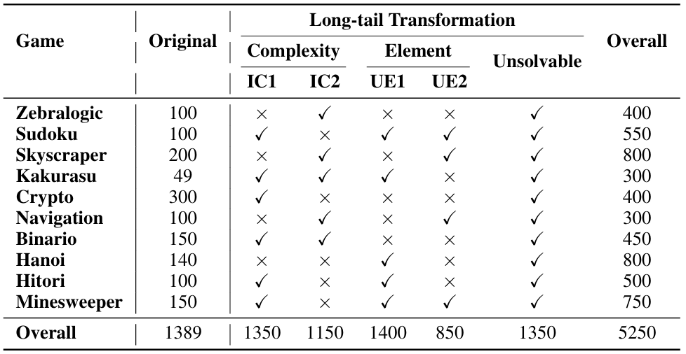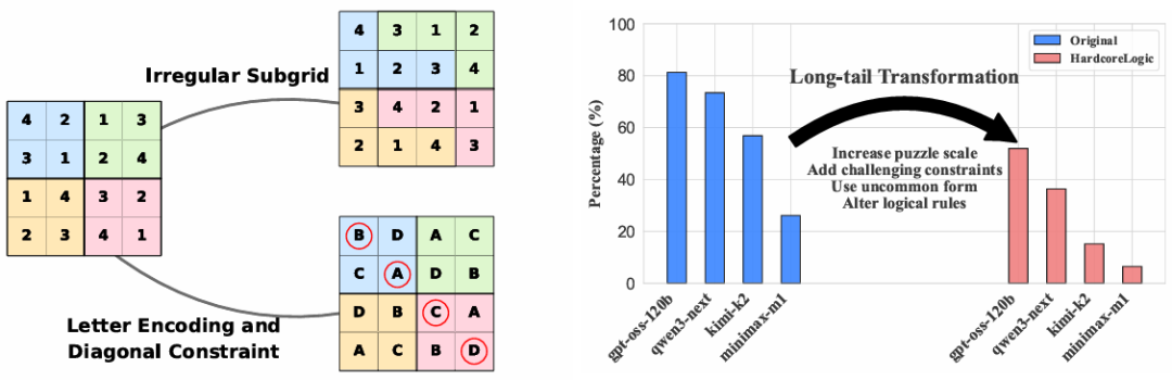 近年来,大型推理模型(large reasoning model, LRM)在复杂逻辑推理任务中展现出令人瞩目的性能,尤其在数独等逻辑推理谜题上已达到较高水平。然而,现有逻辑推理基准(如Enigmata、ZebraLogic)多聚焦于标准格式的谜题(如9x9标准数独),导致模型易过度拟合标准形式、记忆解决方案模式,而非真正理解逻辑规则。这种局限性在面对“长尾”变体时尤为突出: