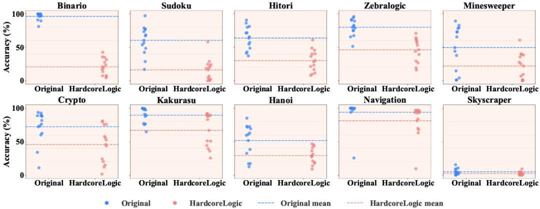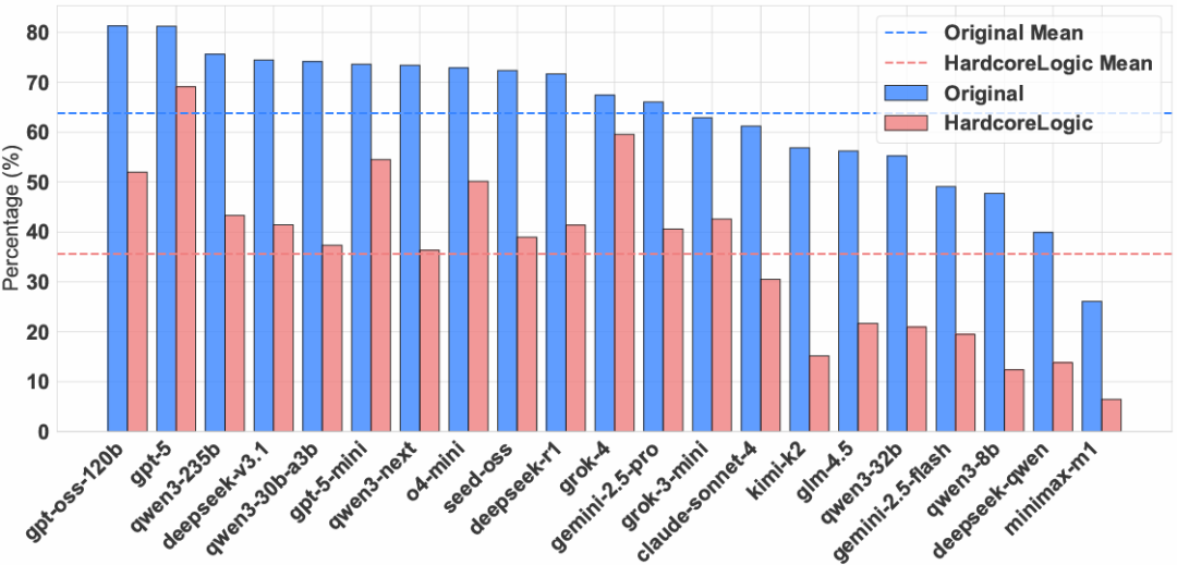 图5 :不同LRM在标准数据集(Original)和HardcoreLogic上的平均准确率。