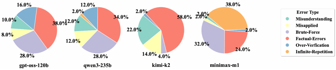 通过对4个代表性模型(gpt-oss-120b、Qwen3-235B、Kimi-K2-Instruct、Minimax-M1)在可解谜题上的50个错误案例进行分类,我们发现了以下六种主要错误类型: