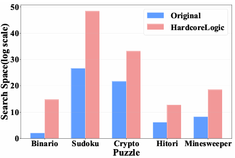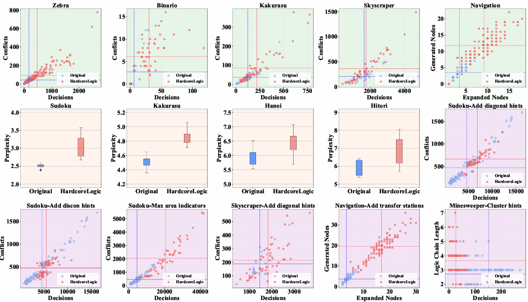 相比基于标准谜题的数据集(Original),HardcoreLogic中的样本具有更高的理论复杂度或模型困惑度: