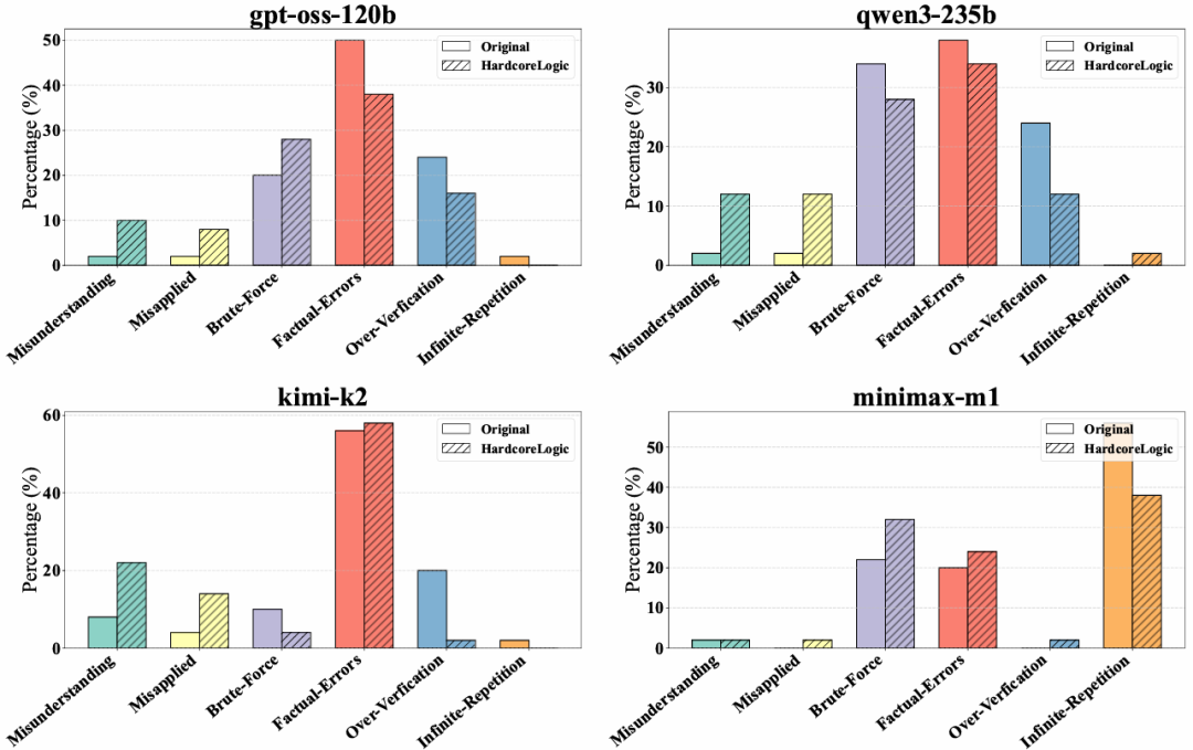实验结果显示,各类开源及闭源LRM在HardcoreLogic上均无法达到常规谜题上的答题水平,并呈现出多种相对普遍的错误模式;而在无解谜题上,许多模型也不能准确判别问题无解或试图强行编造解答。这些结果揭示了当前主流LRM在真实逻辑推理中仍然存在的核心缺陷;HardcoreLogic不仅为此提供了针对性的评测谜题,还能进一步作为一种数据构造范式,持续提供不同难度梯度的谜题数据以帮助模型克服这些缺陷。
