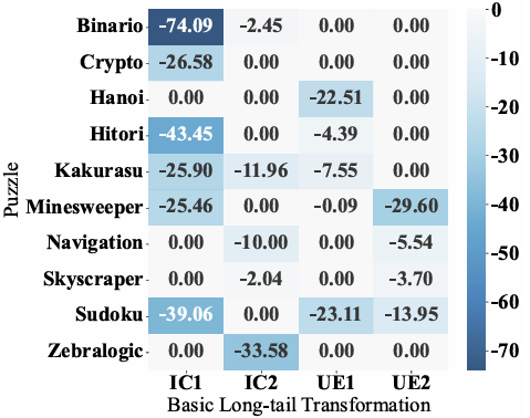 通过加权线性回归分析,我们发现搜索空间扩展(IC1)对模型性能影响最大,表明模型的推理模式对解空间大小最为敏感。此外,非标准元素变换(包括UE1和UE2)在部分谜题(如Sudoku和Minesweeper)上也导致明显的模型性能下降——尽管这类变换未必会使推理过程更加复杂,但仍然对LRM产生了一定误导。